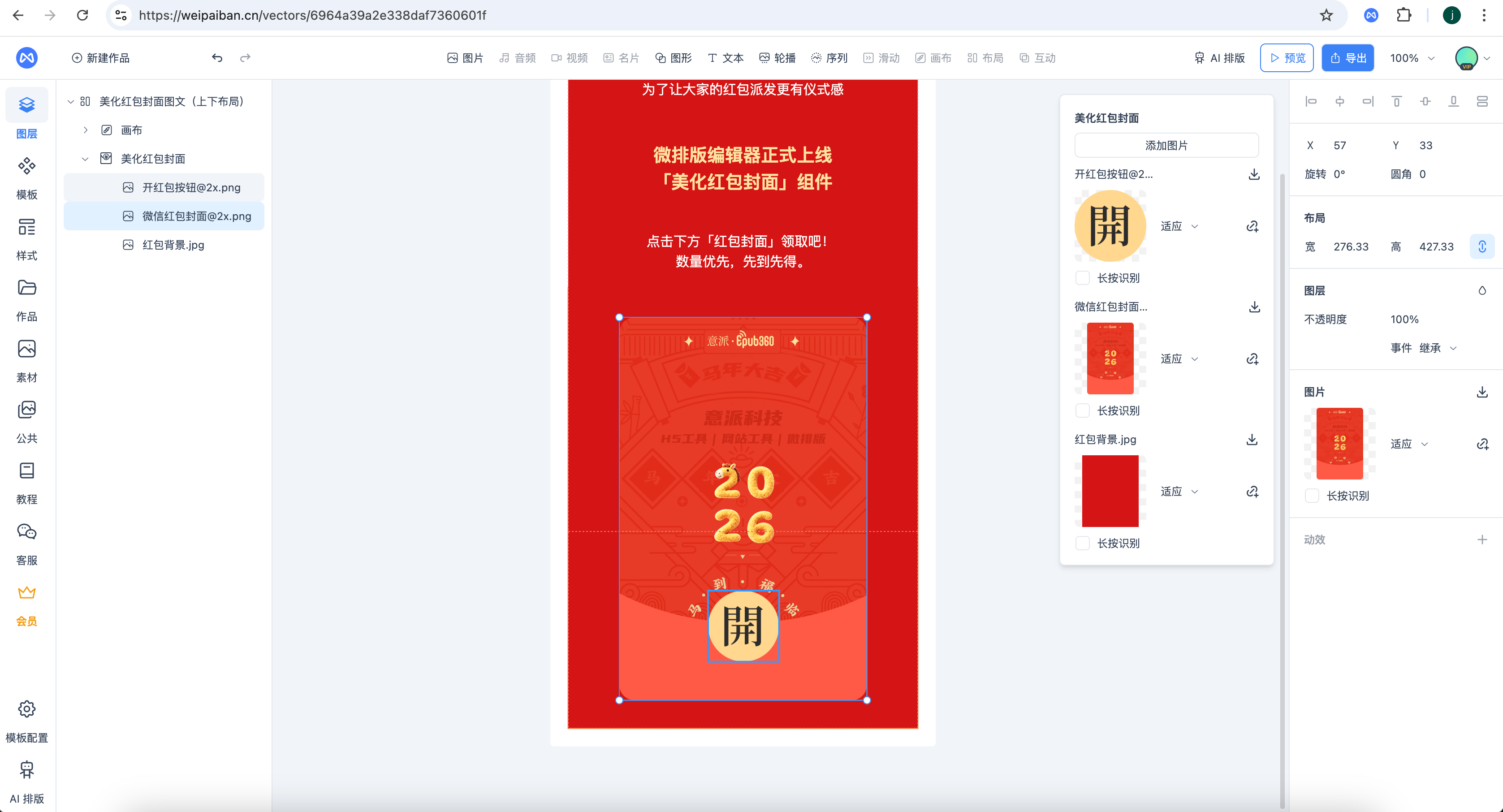 登录微排版编辑器,在上方工具栏“名片”中选择“美化红包封面”组件或在模板区搜索关键词“红包”。
